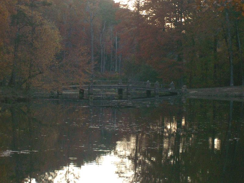 A Rest Area overlooking Ricks Pond, built of open wood frame with tile roofing and stone benches.