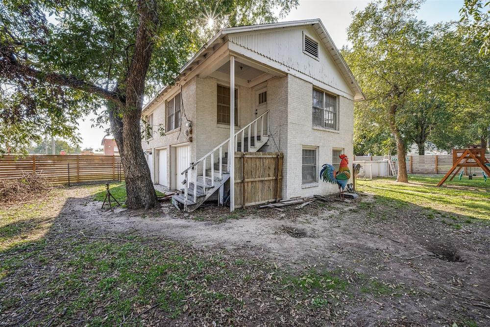 Enjoy the gracious front porch, ideal for relaxing as community parades pass by. The expansive backyard invites various activities: enjoy your morning coffee or evening tea on the shaded deck, stroll through lush St. Augustine grass, garden, raise chickens, swim in the above-ground pool, or utilize the workshop in the detached three-car garage with an apartment above.