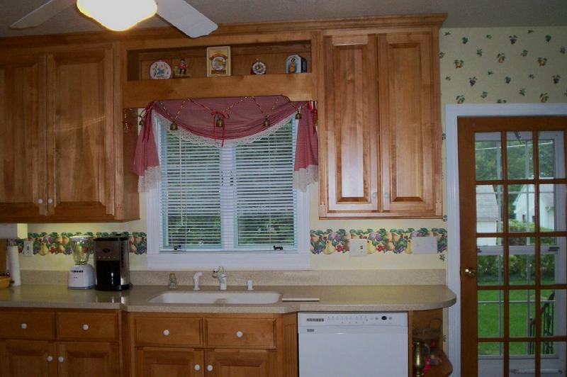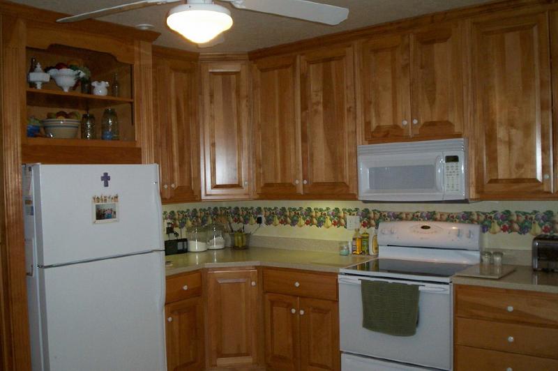 Custom birch cabinets, ceiling fan, frig, electric range with self cleaning oven, m/w with exhaust fan and stainless lined dishwasher.