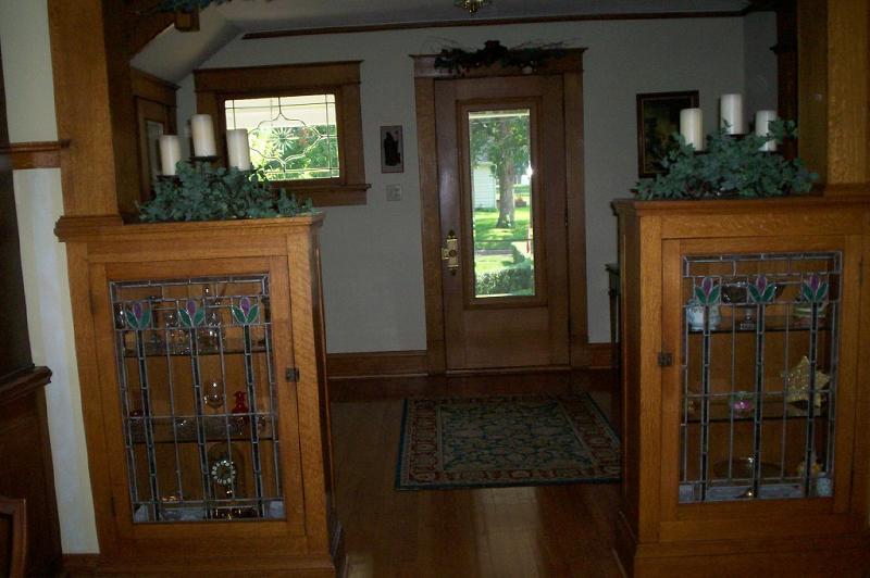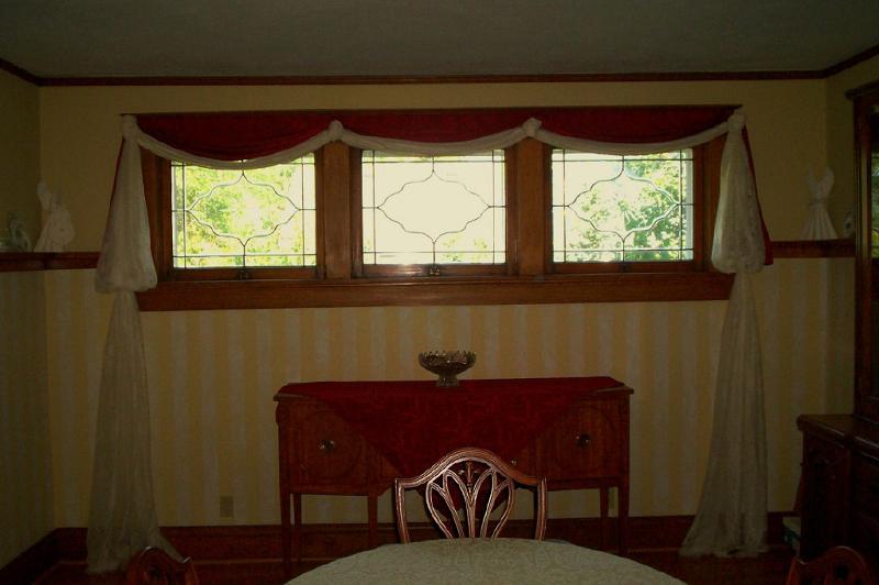 The doors in the built-in storage of the dining room are colored/stained leaded glass. This room also has a plate rail, custom painting and the original brass light fixture.