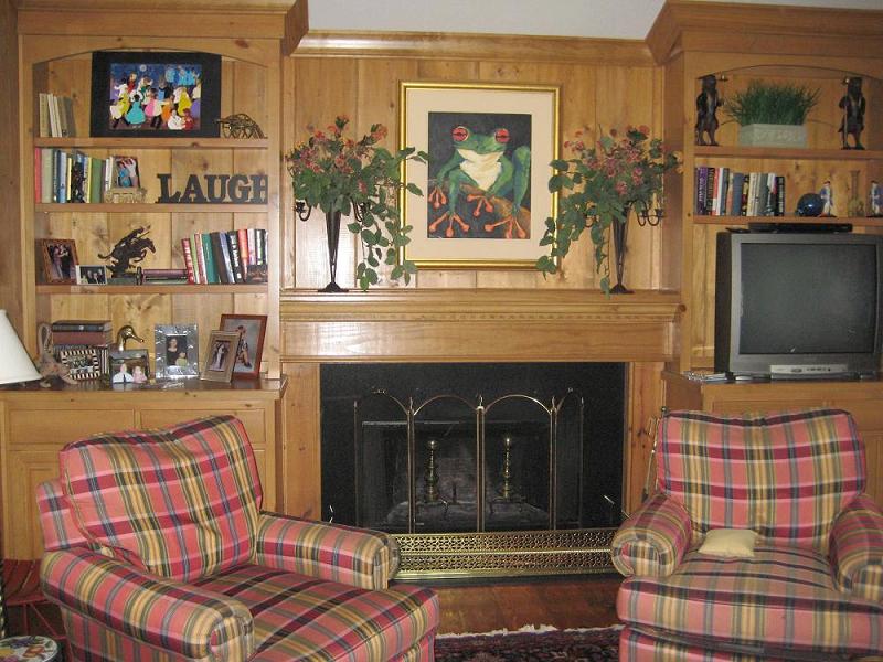 This once was an owner's garage... we now step down into our favorite room, the paneled den, complete with bookshelves and a working fireplace!