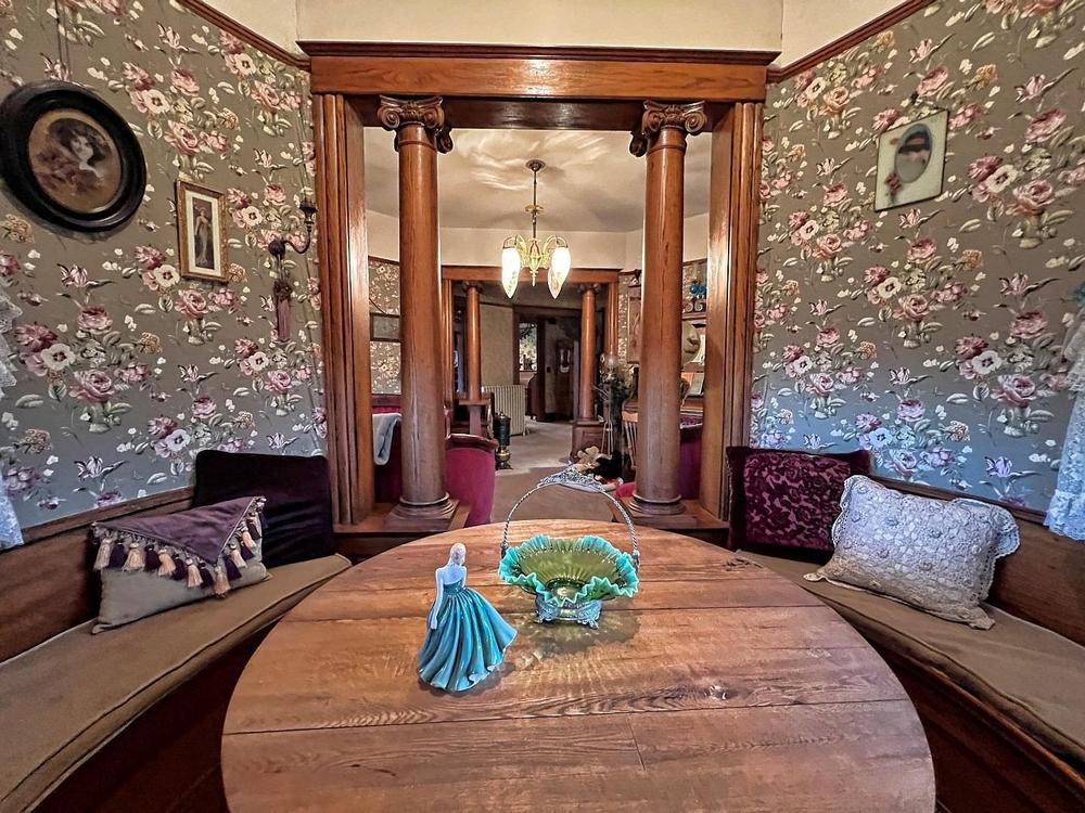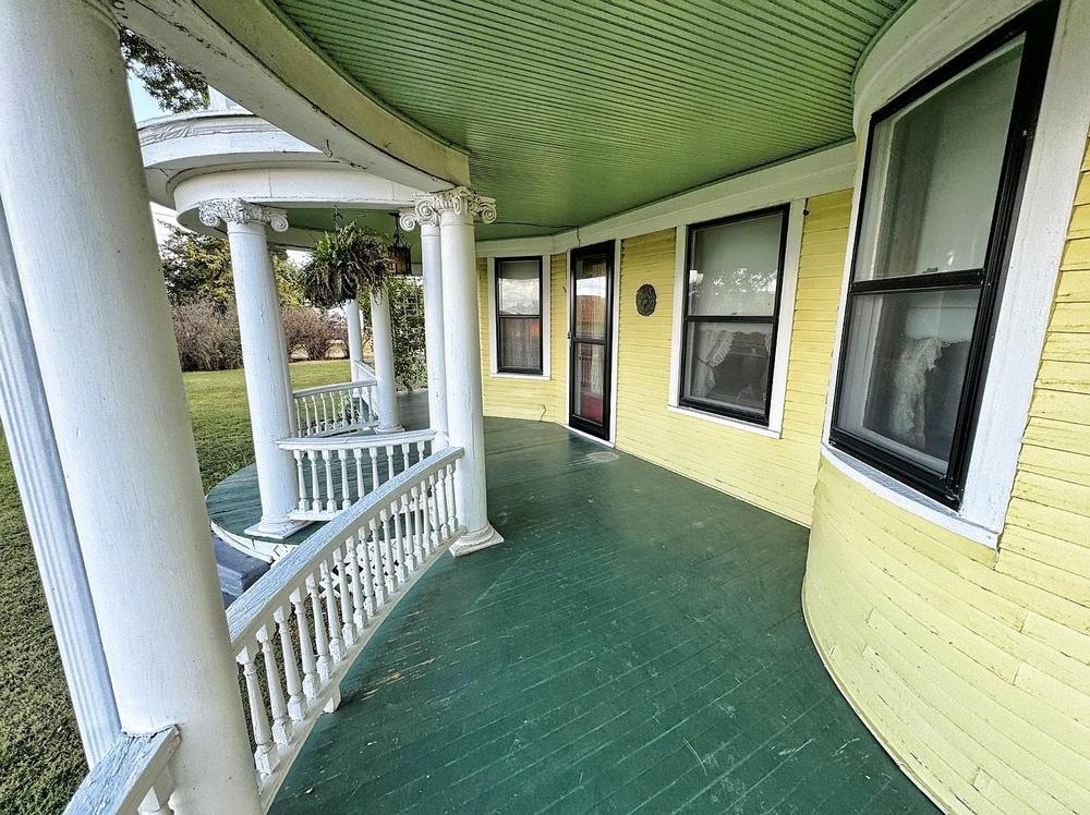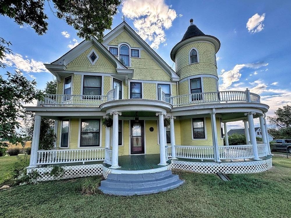 The towering turret and winding wrap-around porch define the architecture of the home.