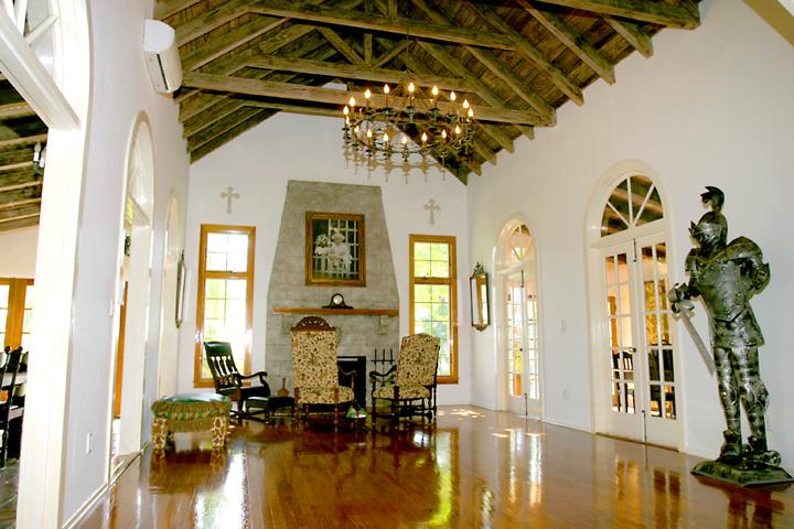 A working stone fireplace with ecclesiastical (and demonic!) detail balances vaulting vertical windows looking out to the water from a croquet tournament lawn, down an 8-foot grade to the Intracoastal Waterway. Original pilings documented by 1947 Arial photographs make building a new dock easy and efficient.
