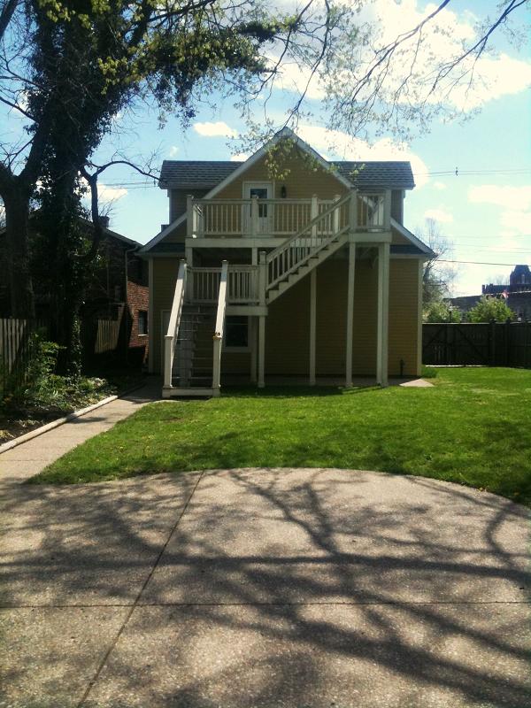 Detached two-car garage includes ~500/sf of finished space above -- with a full bath and set to accomodate a kitchenette.