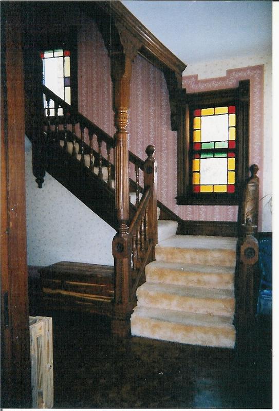 Gorgeous open staircase, original woodwork throughout, 2 rooms with parquet wood floors, pocket doors, all windows with original stained glass borders. All wood in very good condition.