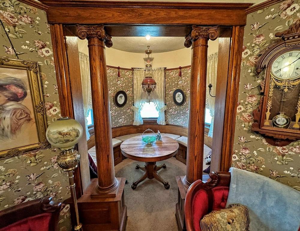 The towering turret and winding wrap-around porch define the architecture of the home.