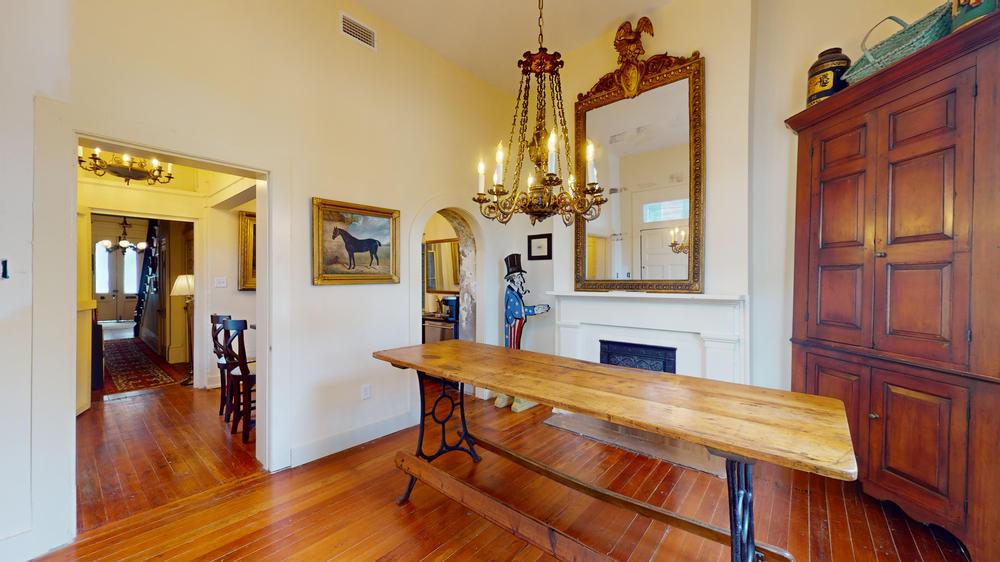 Inside, the hardwood floors, moldings, turned stair rails, multiple coal-burning fireplaces with beautiful mantels, period chandeliers, double parlors, vault room, primitive kitchen, and two luggage rooms add to the property’s charm. The moldings are painted in colors from the Jacqueline Kennedy Historic Paint Collection, reflecting the era of the home.