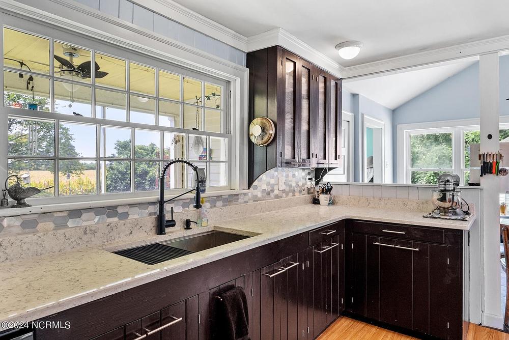 The large, open kitchen has been thoughtfully updated with quartz countertops, a tile backsplash, a kitchen island, and sleek LVP flooring. The adjoining breakfast nook is enhanced by stylish slate tile.