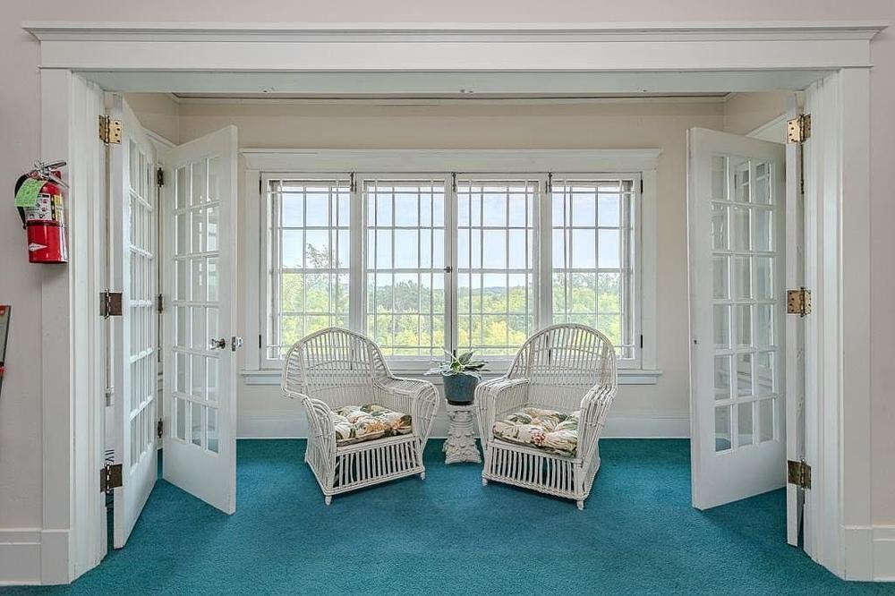 The original Birch kitchen cabinets with French glass doors are both beautiful and functional. The main level is light and bright and has a formal living room, a serene family room with a tile woodburning fireplace with historic stained glass window inserts on each side (the stained glass windows are negotiable), a dining room with built in barrel shaped cabinet doors, a bedroom with an attached half bath and a kitchen with a dining area.