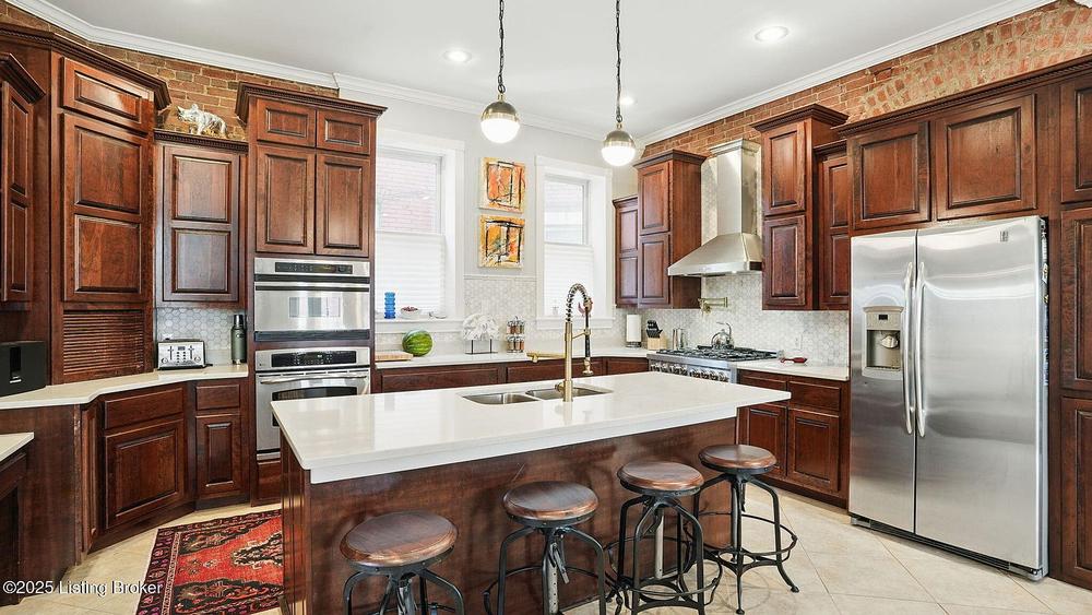 The dining room has a wonderful built-in wet bar with glass face cabinetry, granite top and a hammered copper sink. Behind the dining room is the family room with cast iron mantel, which is totally open to the wonderful fully equipped kitchen with exposed brick, quartz countertops with hex tile backsplash, a large center island, a Zline gas range and a planning desk. Behind this area are 2 bedrooms with a newly updated full bath (a rarity in Old Louisville).