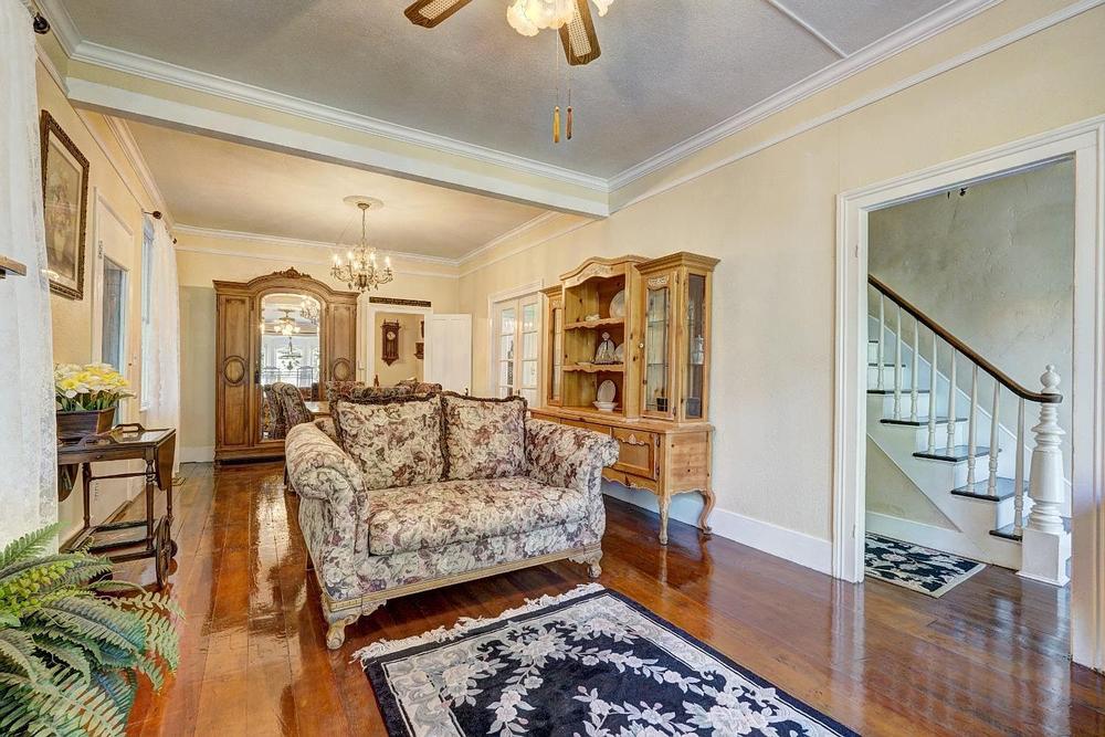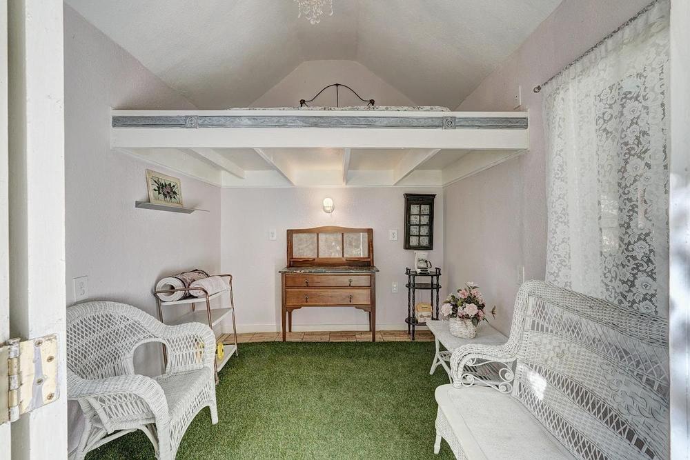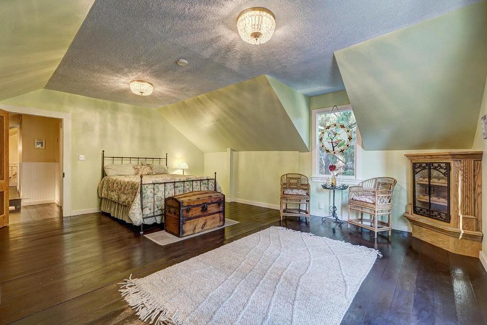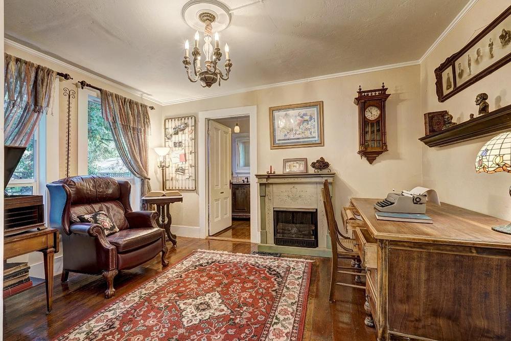 The inviting covered front porch wraps around the side of the house, providing a perfect spot to enjoy the fountain, relax on the deck, and appreciate the tiered backyard, which is beautifully landscaped with flowers, mature fruit trees, and plants, as well as a separate yoga/art studio.