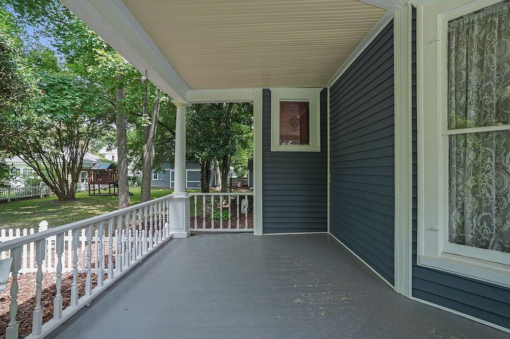 Enjoy views of the town park from the wraparound front porch or unwind on the screened back porch. A detached one-car garage with loft, two sheds, & fenced yard with swing set complete the package.