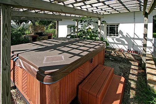 View of the house from the south, showing second driveway, porte-cocherre, hot tub and garage.