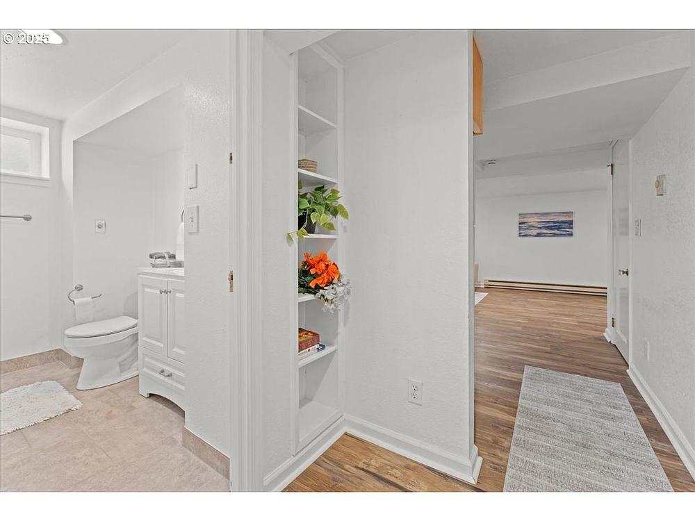 Connected, circular flow on the Main floor with two bedrooms including one as the perfect office overlooking the backyard. Two additional coat/storage closets, storage nook and Full Bathroom with charming built-ins and tiled floor.