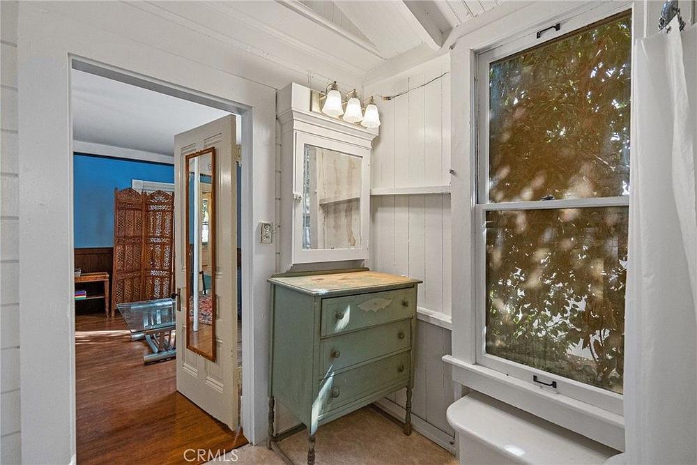 Outside, the backyard is a private affair, nestled into the junction of the workshop and the primary home and bordered by mature trees. Various garden vignettes make for an outstanding place to relax or entertain. On the opposing side of the breezeway from the primary house is the workshop in laundry area. Currently in use as a laundry room and workshop, this space could be converted to an ADU with its own entrance.