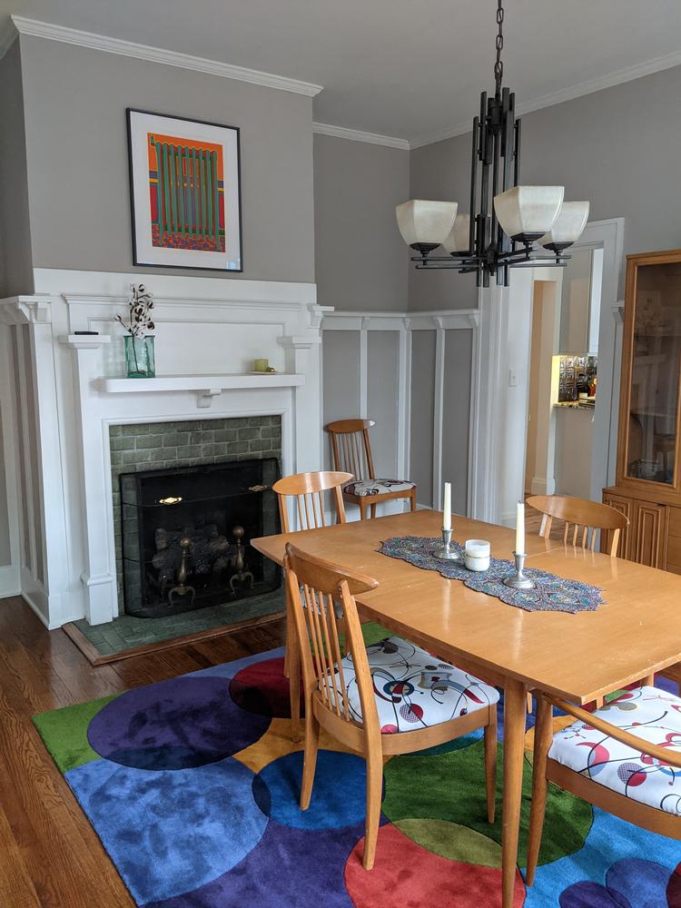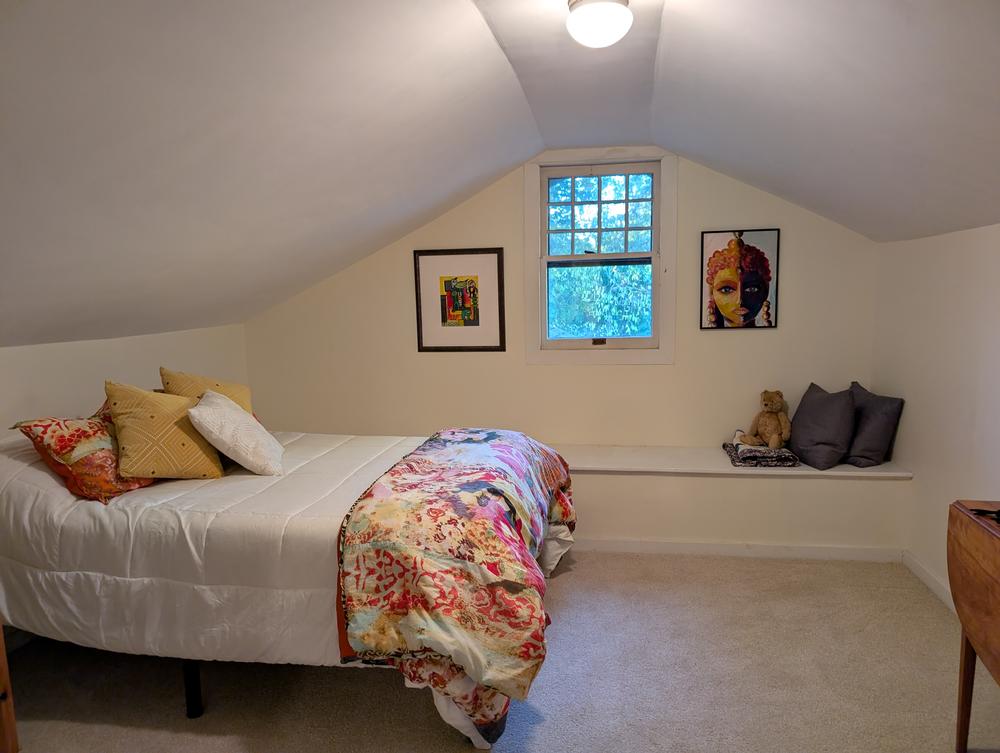 This house of approximately 2400 square feet feels large. The first floor has 10' ceilings and tall 12-over-1 windows. There is tile in the laundry and bathrooms, and hardwood floors throughout the rest of the house. The solid wood doors--both exterior and interior--are original. There are two French-style interior doors stored in the attic. The kitchen and owner bath have been fully renovated and updated. The second floor's sloped ceilings give the two bedrooms and half-bath a cozy area for guests and children. Unusual for Wilson, there is a basement room, currently the owner's studio.
