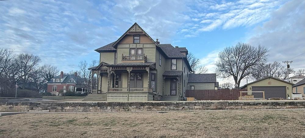 Discover this stunning Victorian residence, showcasing remarkable original woodwork, lighting fixtures, and built-ins, all complemented by modern updates. Nestled on a spacious corner lot with a generous lawn, this home is a true gem!!Step onto the inviting Victorian front porch adorned with a beautiful bead board ceiling. The updated exterior paint, featuring period colors that reflect its 1886 origins, enhances the home`s charm. Enjoy watching the Kansas sunrise with your morning coffee or relax in the cool evenings on the east-facing porch, which leads you into a magnificent foyer showcasing exquisite woodwork and an open stairway.