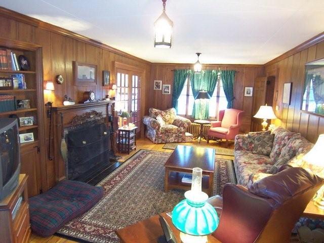 original wood paneling and wonderful fireplace for a cozy new england living area