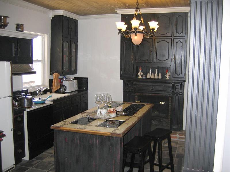 kitchen with old door Island, fireplace,french country.Beadboard celing.