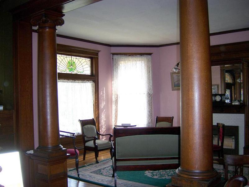 Off the foyer, the formal parlor includes beautiful wood work, a gas fireplace, stained glass and a converted gas light fixture.