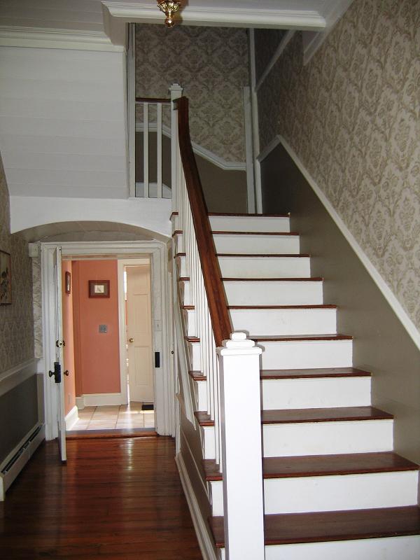 Entering the front door brings one into a wide center hall finished with rare elegance. Flooring consists of wide pine boards which have aged to a fine patina. Walls are plaster above a molded chair rail, with solid wide panels cut from a single width of pine below. At the beaded plank ceiling there is an elaborate wide classical cornice. Intricately molded casing frames window and door openings. At the right rear of the hall a skillfully crafted stair rises in three runs some fourteen feet to the second floor. This stair has been changed several times since first built. Originally the staircase was located on the Southeast wall (parlor). The house used to have a Quaker floor plan. That was changed by the addition of a partition to create a central hall. However, the original rail and balusters appear to have been preserved and installed in proper sequence. The stair brackets are gracefully turned scrolls. Between the chair rail and stair stringer there is a triangular panel defined with a fine classical molding and ornamented with a carved wood garland.