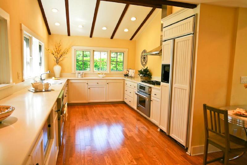 The north wing of the home has a country flavored kitchen with so many windows there’s a feeling of being outside. There’s a GE Monogram fridge, a 5-burner Thermador stove, two Jenn-Aire convection ovens, and an abundance of shelves and cabinets.