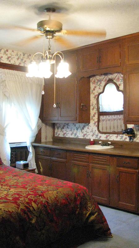 This bedroom is spacious, has a lot of natural light and builtin cabinets and vanity with sink.