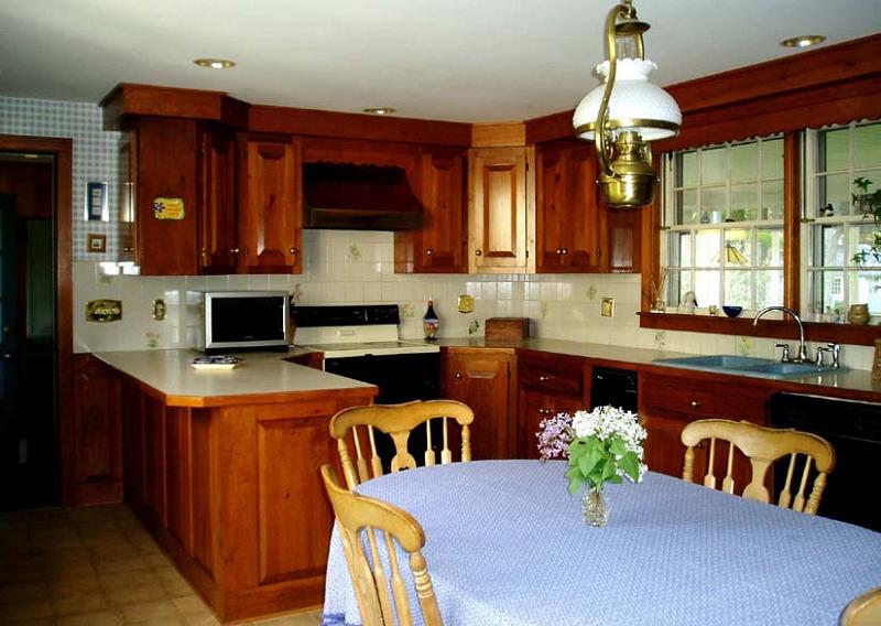 Picture shows renovated kitchen of Colonial. Easy to cook and entertain with lots of surface area and room to sit. Screened in porch can be seen through windows on right.